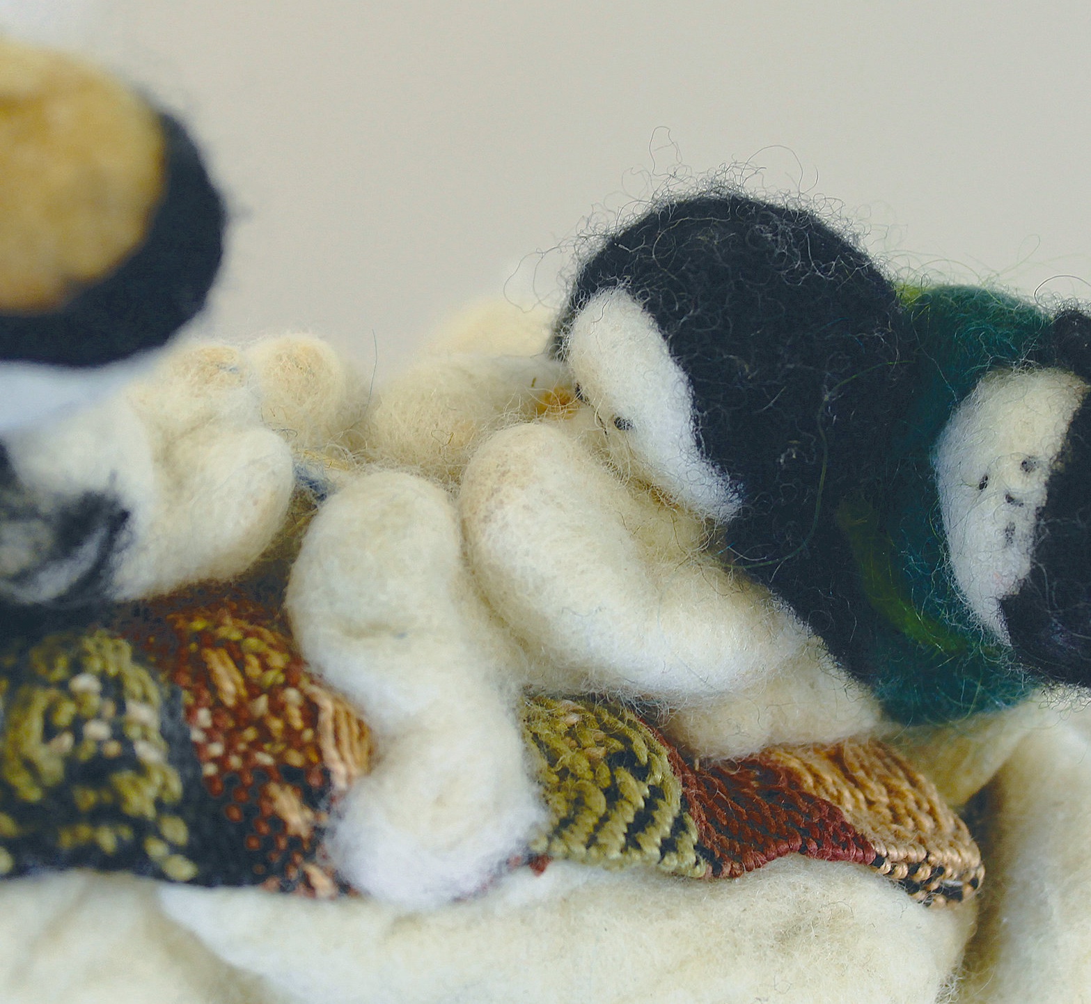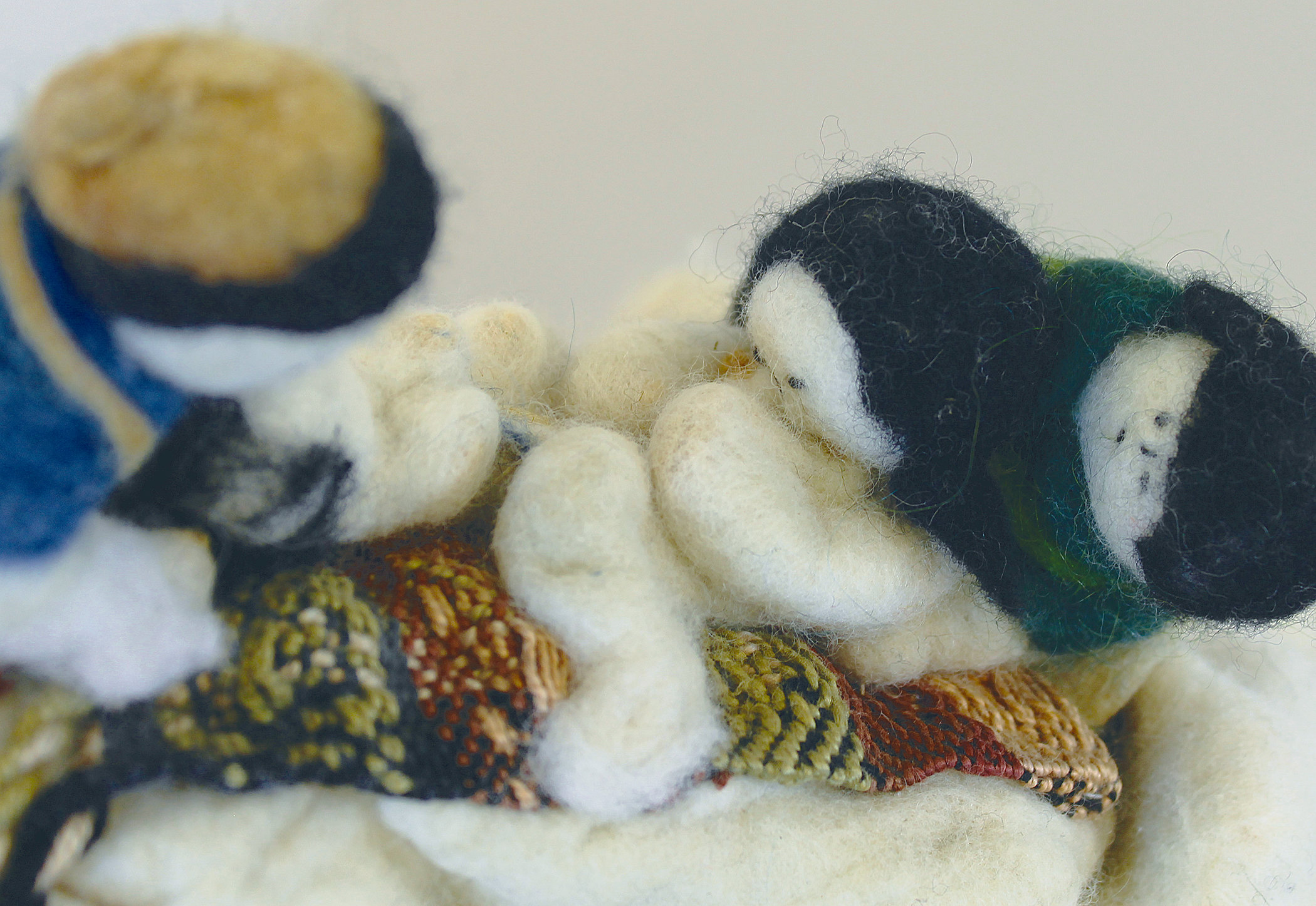 Mother Earth's face is handwoven in Merrill's Zati method of natural white Maine island wool, felted onto a wet-felted merino wool cloche-like headpiece for wearing as a theatrical or ceremonial mask. Her hair is natural white locks of un-spun Maine island sheep's wool. The handwoven bed cover's warp is extended into a hanging cord and tassel. The figures are wet-felted of merino wool, with merino clothes dyed various colors. The midwife's cap is dyed with goldenrod, her coat is dyed with wild indigo, and the doula's coat is dyed with wild indigo to a shade between green and blue. The bed cover is handwoven by the artist in a Colonial coverlet pattern called Rose Path. The guardian on Mother Earth's right side has a helmet handwoven of miniaturized Rose Path, with antique silver beads; the guardian on the right has a similarly woven shield.