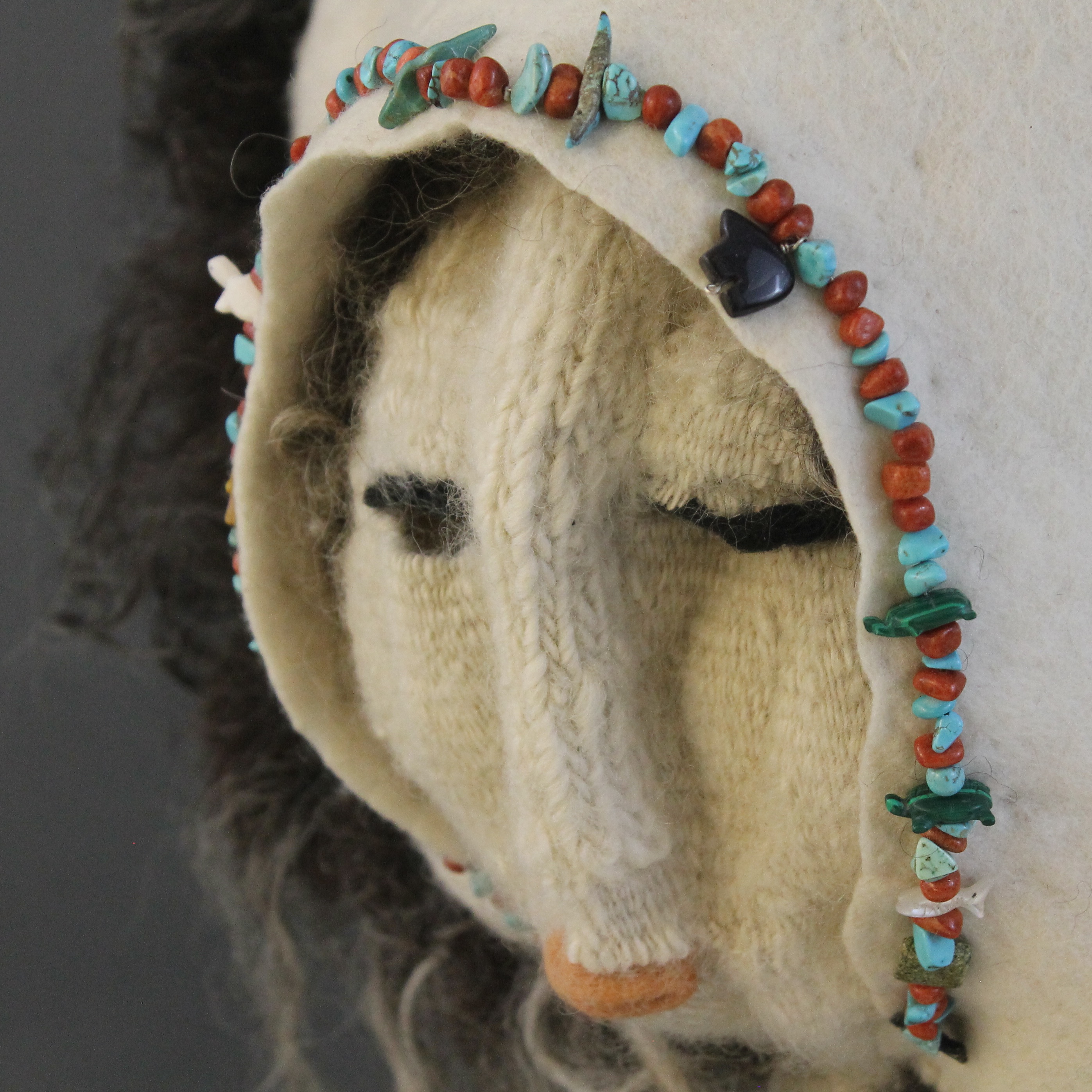 This sculpture begins with a beautifully sensitive face with a prominent nose and pale lips. Her wide conical white merino headdress is finished with a wild ruff of Maine island ram's woolen hair. The face is haloed with an arch of turquoise and faux coral beads, interspersed with animal totem carvings of fish, otters, bear and turtle of various semiprecious stones such as jasper, onyx, turquoise, and light chalcedony. The atmosphere of this being is of contemplation on her animal children, and inner awareness and peace.