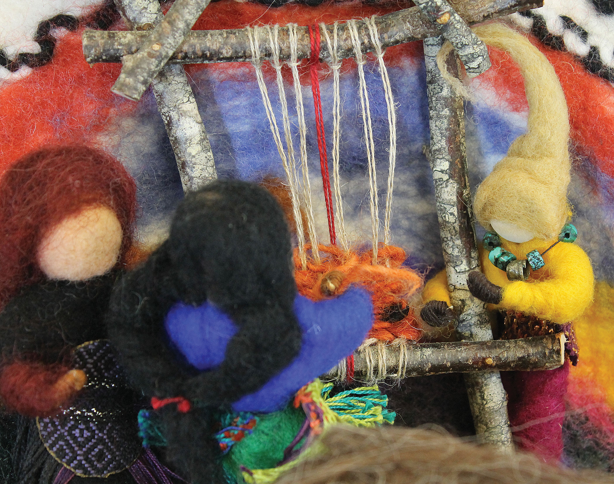 The loom is made of birch twigs which Merrill cut, drilled and pinned together post-and-beam-style with tiny wooden pegs. It is warped with linen, with a red center thread, and woven with madder and goldenrod-dyed handspun and natural black. The figures are wrapped and wet-felted merino with wire armatures, and dressed in colorful merino garments. The figure at the left is wearing a bodice of a round of Merrill's miniaturized colonial coverlet weaving in cotton and bamboo threads. The center mother figure has two black braids tied together, and a colorful handwoven cotton bodice with fringed warp ends. The figure at right has a high pointed goldenrod-dyed merino hat and a necklace of turquoise beads with a center bead of antique Tibetan silver.