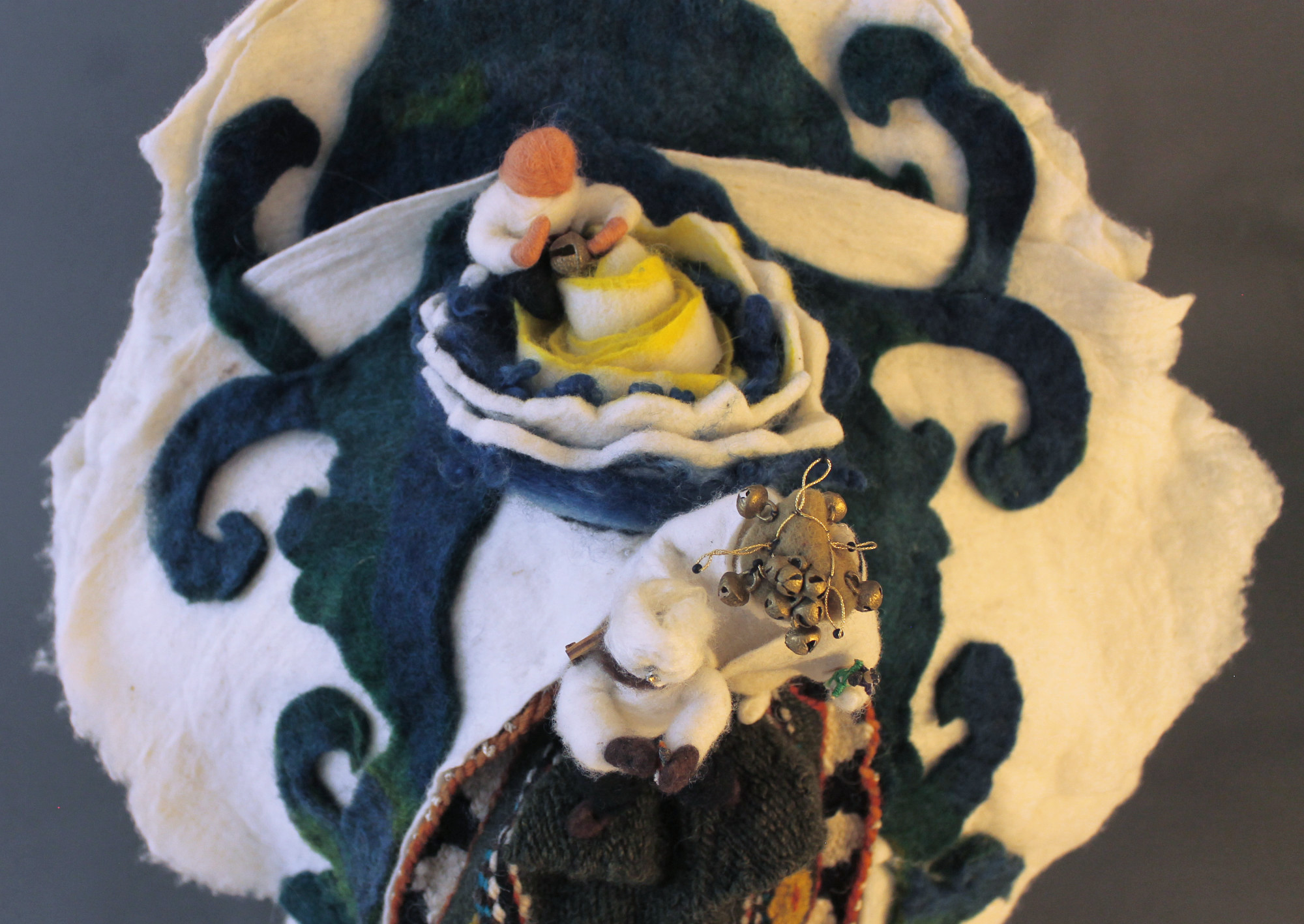 The sculpture Mentor has a unique relationship between the face of Mother Earth and the figures of her children. Mother Earth is richly colored, with a spreading white headdress decorated with an extravagant felted Kazakh-style shyrdak design in deep indigo blue. The pair of figures on her forehead are a mentor holding two minuscule matchstick-type figures, and a creative artist who is making an another one between her hands. The creative artist wears a white felted hat with a tiny pearl. The creative artist's feet are planted directly on Mother Earth's eyebrows, with which she seems to be content. The mentor is dressed all in white and wears of crown of brass bells cast in India, symbolizing a heavenly sound. Behind the pair there is a lotus flower, in which a third figure is meditating with a bell.