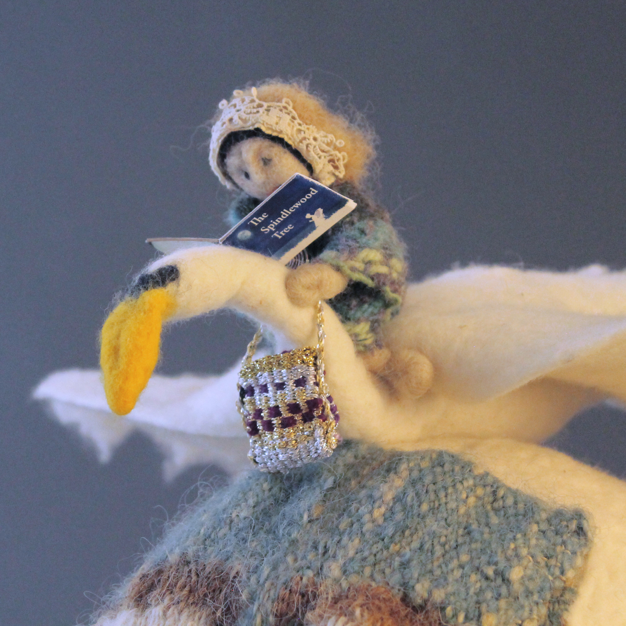 Mother Earth supports a figure riding on a swan and reading a book. If other figures were near, she would read aloud to them, a little like Mother Goose, whose origin dates to the late 18th century in France. Mother Earth's indigo-dyed face with white eyelids and brown eyebrows, is animated as if she is telling the story from the book. The figure on the top is reading a book called The Spindlewood Tree, named for the shrub Euonymus europaeus, European spindle, which has straight, very hard branches which were used in the past as spindles for spinning wool by hand. It has richly-colored red berries and in Europe has an association with fairies. The story by Charlotte Comeras is based on a poem by Rose Fyleman, who was famous for her children's stories about fairies. This was Susan Barrett Merrill's favorite story to tell when she taught in Waldorf schools.