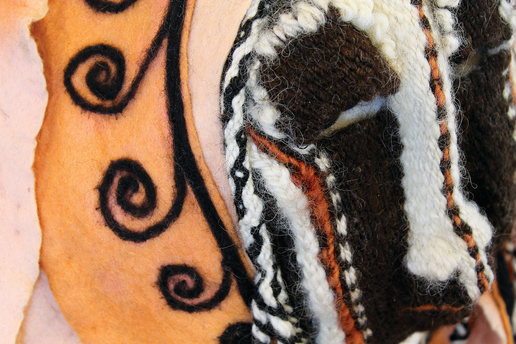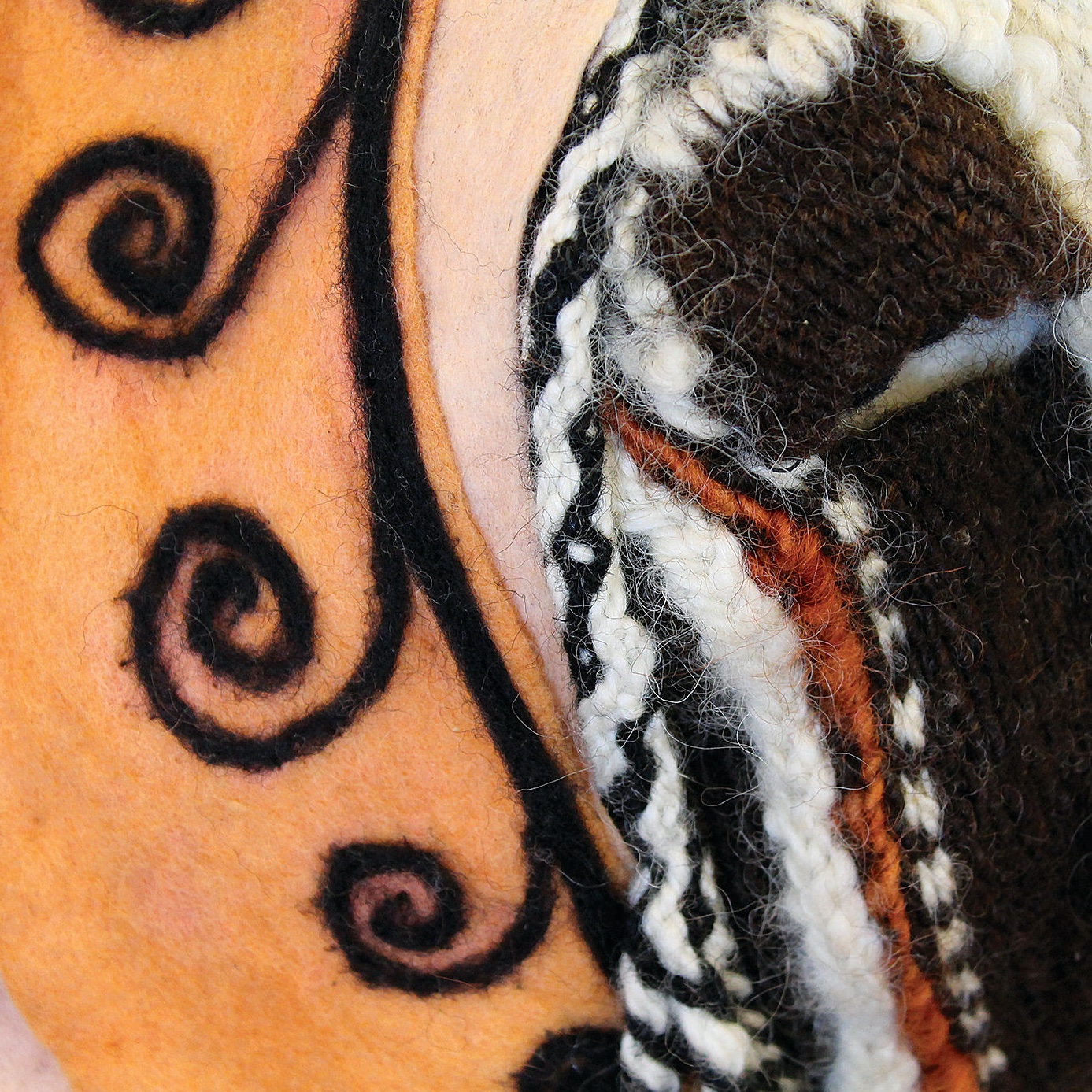Radha is handwoven of handspun black and white Lincoln-Romney wool, with madder-dyed lines and lips. Cords of Bolivian round-weave and twining frame her face. The madder-dyed headdress has curling tendrils of smoke, and flames of madder wool. All spinning, dyeing and felting is done by the artist.